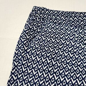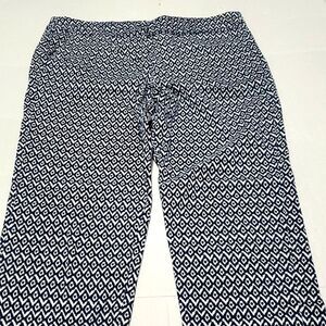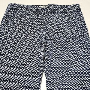 Blue and white boho geometric straight leg pants. Hook and zipper closure. Slit pockets on the front and tailored pockets on the back. 97% cotton and 3% spandex.