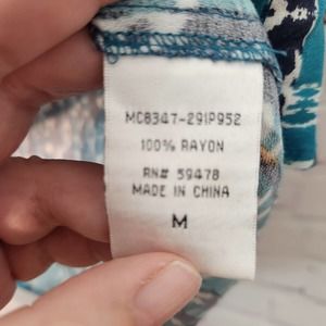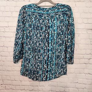 Stylish Kenar blouse with a vibrant blue and white pattern. Features a flattering V-neck and three-quarter sleeves. Perfect for casual or office wear.