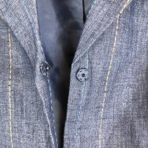 Kenar blue linen blazer with subtle stripes. Snap front, notched collar with waist side tabs and cute pleated pockets. Fully lined. Gently worn in very good condition. Size 4.
