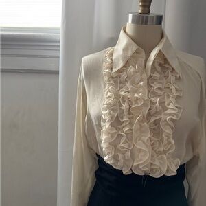 Romantic cream blouse with ruffle front. Ruffle at sleeve cuff also. Button down shirt. Perfect for tucking in a pencil skirt. Elevate with a blazer. Perfect for elegant occasions. A little sheer, would need a camisole underneath.