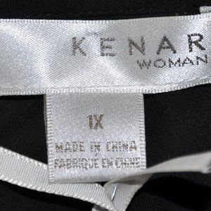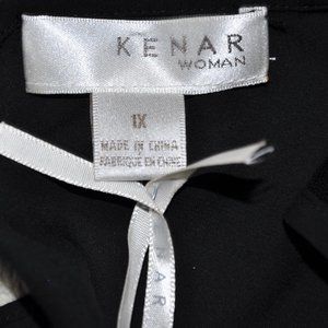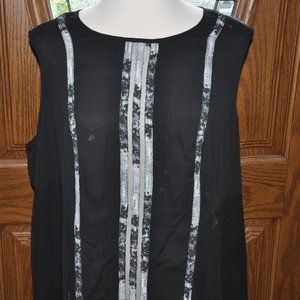 This is a very pretty black silky sleeveless summer top with thin black & white fabric strips in the middle of the blouse and on both ends in the front that are a stunning contrast to the black. It's a very comfy blouse and still has name tags on it. I don't believe this was ever worn!