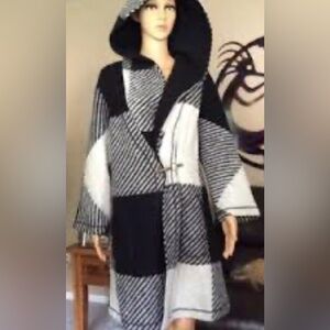 Kenar Wool Blend hooded coat jacket black white buffalo plaid large