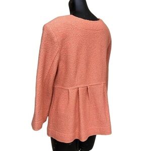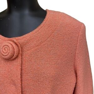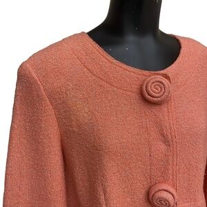 Kenar Wool-Blend Peach and Silver Lurex Blouse Cardigan. Fabric rosebud trim at center front, 3/4 Sleeves, peplum pleated bottom, snap front closure. Size XL