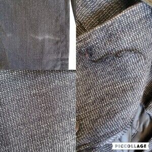 Things to note: There is all over pilling present (an example is pictured). The hidden button on the inside of the waistband is missing (pictured). There is a stain on the leg (pictured).