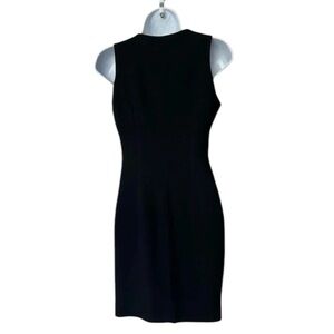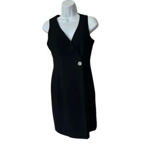 Kenar wrap sheath dress in black. V neck. Sleeveless. Rhinestone button. Fully lined. Bust 17” waist 14” length 33”. Excellent condition. Size 4P