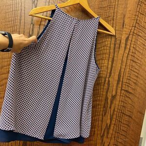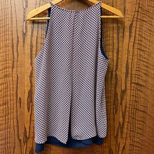 Like new Kenar red and blue geometric print Georgette double layer halter neck sleeveless flowy tunic tank blouse. EUC, great shape, polyester, size medium, high neck, zip back, split open top layer on back, see pictures for details.