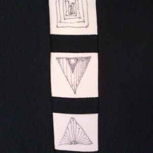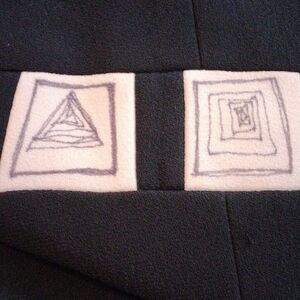 Vintage. Sold at J. Belle, Lubbock, Texas, this is a one of a kind dress. The little appliqued squares have been hand decorated in geometric designs. The fabric is crepe like. Fully lined, back zip. Size 8 measures 37 at chest, band under chest 30, 30 at waist, 38 at hips. 35.5 long from shoulder to hem. You won't see this one anywhere but in your collection.