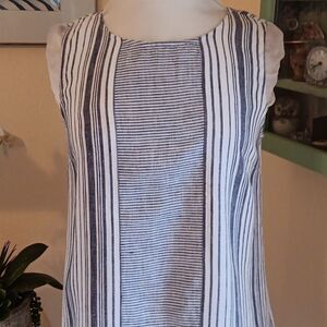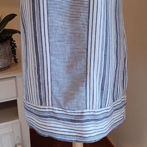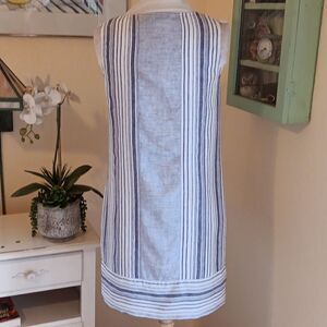 Perfect little shift for warm weather. Contrasting panel down the front. Bottom hem has a double layer trim that helps the dress hang perfectly.Denim blue and white stripes. Size 6 measures 36 at chest, 38 at waist, 40 at hips. 35 long from shoulder to hem. Perfect for warmer weather.