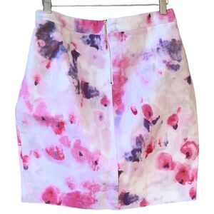Beautiful spring skirt in pink. Purple and white. Exposed zipper, kick pleat. 20” waist. Size 14 New with tags.