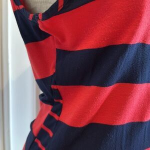 Color is navy and a coral-red, with gold tone buttons. Shirt shows some signs of use—please see photos for light pilling on fabric.