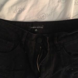 black destroyed denim shorts. the zipper is broken but it's not noticeable when they're buttoned lol , says 24 fits like a 23.