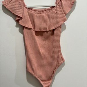 Kendall and Kylie pink off the shoulder bodysuit. It is ribbed and snaps at the bottom.