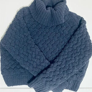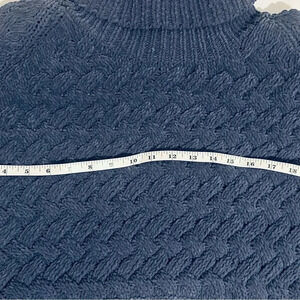 This deep periwinkle blue sweater features a stylish turtleneck design and a prominent cable knit pattern that adds rich texture. It has a slightly relaxed fit and a cropped length, making it a perfect choice for layering.