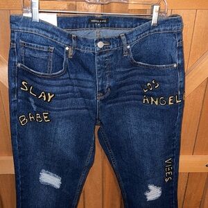 Words “SLAY, BABE, LOS ANGELES, VIBES” are featured on front of jeans