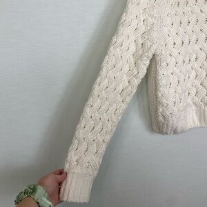 This sweater is a great one for layering. It could be worn with a polo underneath for a more academic look, or toned down with a tank for a more breathable look. This weather is on the thicker side, but it does have the loose knit to allow for warmer weather. This sweater is a cream/off white colorway and would pair nicely with high rise jeans or a skirt. It has more of a cropped style as well.