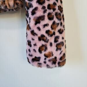 Features: Pink leopard printed faux fur (100% Polyester). Jacket. Long sleeves. Front zipper closure closure. Fully lined. 18" from shoulder to hemline.
