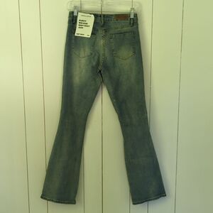 Mid blue wash baby boot jeans. Mid rise , button and zipper closure. Ripped.
