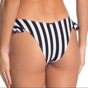 Adorable black and white striped bikini by Kendall & Kylie. Strappy open back, ruffle bottom.