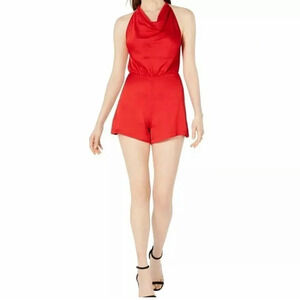 A total showstopper. Kendall + Kylie's red-hot romper shows off a little skin with its short silhouette and open-back styling, finished with an adjustable tie. Approx. inseam: 3-1/2" Draped halter neckline with snap button closure; Back zipper and tie closure Red; slightly sheer; relaxed fit Unlined Polyester Machine washable NWT