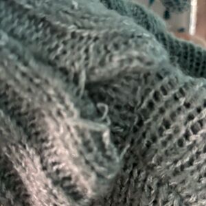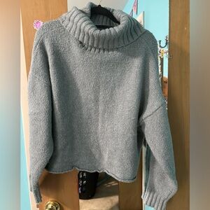 Gray knit cowl neck sweater. Size lg. small tear in the cowl, pictured and price reflects that.