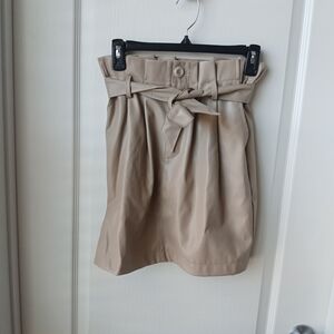 This high-waisted Faux leather skirt in a chic tan color features a stylish paper bag design with a gathered waistline and a matching belt. The pleated details at the waist create a flattering silhouette, making them perfect for a polished yet casual look.