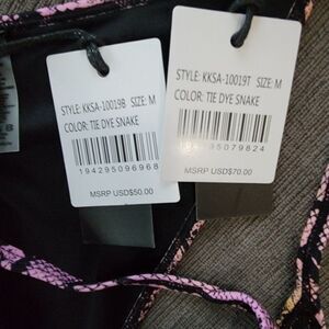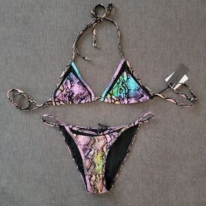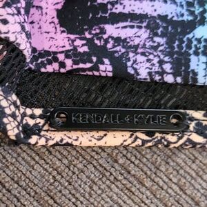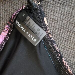 Kendall & Kylie Women's Mesh Trim Tie Dye Snake Triangle Bikini Set Size Medium. This classic triangle bikini set features a teeny design with sheer mesh panels for contrast. Lined. Nylon/spandex. Machine wash. TOP. Halterneck. Back ties. Triangle cups. Mesh trim BOTTOM. Pull-on style. Strappy sides. Mesh trim