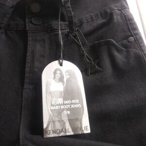 Kendall & Kylie black mid-rise kurvy baby boot jeans, zipper and button closure, 5 pocket