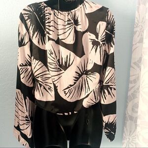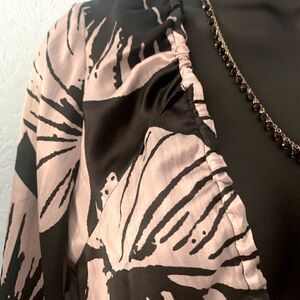 Beautiful leaf print silk crop top. Rusched drawstring neckline that ties at cropped waist. Peephole at the waistline. Long bell sleeves with elastic cuff. Fully lined. 100% silk. Black and greyish/tan. New with tags. Kendall & Kylie Size Medium