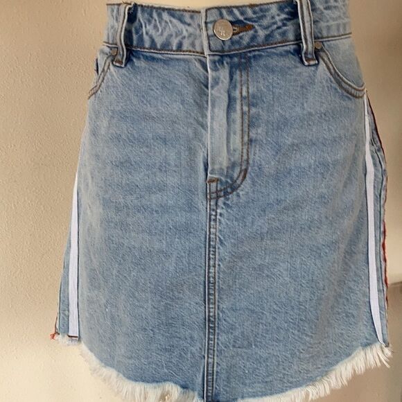 Kendall + Kylie denim mini skirt with red and white ribbon detail on the sides. Five pockets.