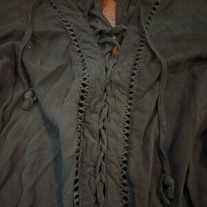 Beautiful colorful stitching and embroidered lace on sleeve and hemline. Lace up vneck