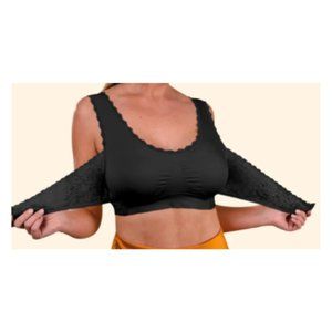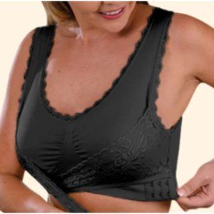 This bra has elastic lace front cross hook-and-eye straps for a secure fit and stabilizing push-up effect. The stretchy wrap-around feature and padded inserts work together to lift and support. The Font Buckles Bra lifts and stabilizes your breasts with its wireless design, giving you a perkier appearance and deeper cleavage.