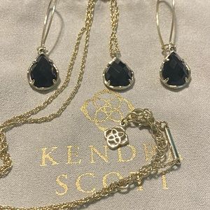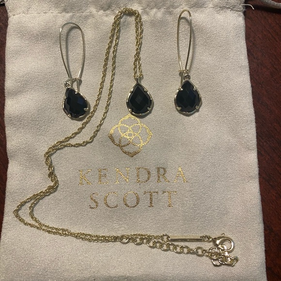 Kendra Scott Gold Kiri Teardrop Pendant necklace and Dee Teardrop earrings with Black Opaque Stone