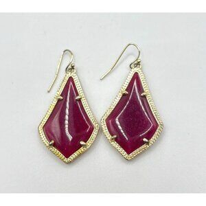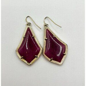 Elegant statement earrings featuring deep burgundy glass stones set in intricate gold-toned metalwork, designed with a distinctive teardrop shape and delicate filigree border. Suspended from slim fish hook earwires, these earrings offer a sophisticated accent to professional and evening attire.