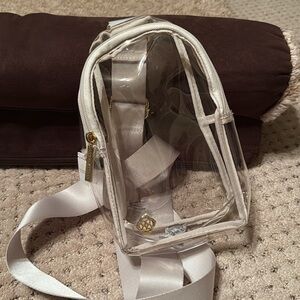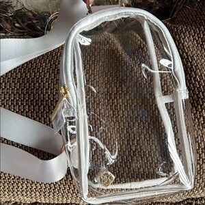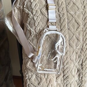 Stylish clear crossbody bag. Features a sleek strap. Perfect for game days or concerts!