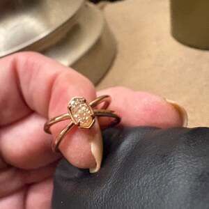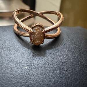 Size 7 Kendra Scott Emilie Double Band Ring featuring a stunning rose gold frame and glimmering sand drusy stone. This elegant ring has a unique crossed band design, adding a modern touch to a classic piece. Perfect for adding a subtle sparkle to any outfit. No tag but new with box!