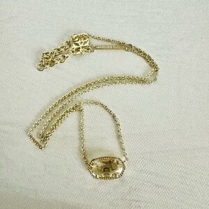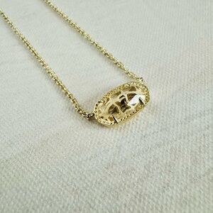 This exquisite Kendra Scott necklace features a gold-toned, oval pendant with intricate detailing, suspended from a delicate chain. Its minimalist design and elegant finish make it a versatile accessory for any occasion.