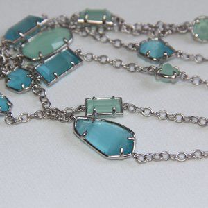 Kendra Scott Jackinta Chalcedony Necklace. Beautiful Combination of Shapes and Colors of Aqua and Seafoam Green Chalcedony Stations on a Rhodium Plated (from the Platinum Family) Long Necklace with J-Hook. Wear Long 36” length or Double Wrapped. Kendra Scott Signature Logo. Weight 25 grams. Retail $175.