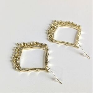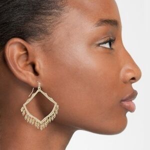 chandelier earrings by Kendra Scott sculpt light and shadow into striking form with that rare balance of elegance and side. An open diamond-shaped frame suspends delicately, finished with sculpted fringe that fans beneath like modern tassels. They bring edge to an evening look and a whisper of boldness to everyday wear.