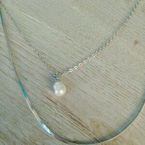 Silver toned necklace with two strands. One strand has a pearl pendant. Excellent condition.