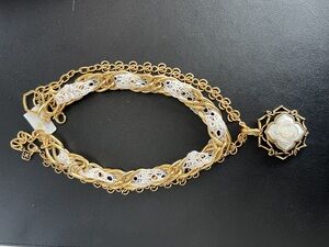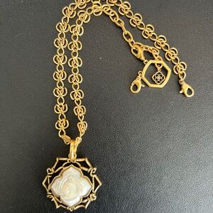 Brand New With Tags! Never Worn! This convertible necklace features two strands in vintage-style metals—including one with intricate lace detailing woven throughout—and a removable stone pendant in a sculptural carved rose shape. Each necklace strand and the charm are removable, giving you so many ways to style this stunning piece.