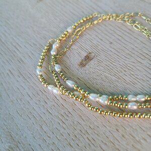 Set of 3 stretch bracelets (meant to be worn together, comes with a small connector) with gold toned beads and pearls. Best for fairly small hands/wrists. Excellent condition.