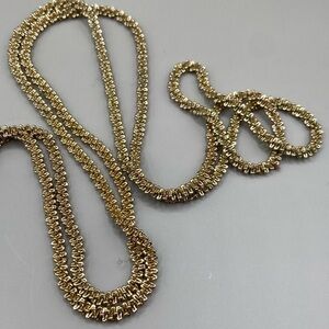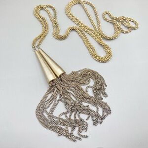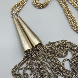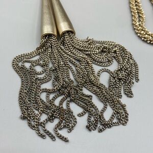 Kendra Scott Phara necklace in 14K gold plating. Good used condition, some light wear, tassels have faded slightly to silver, a little green tarnish in some areas deep in the grooves of the chain, please see Pictures. The 48.5 inch cord can be worn and tied in a variety of different ways!