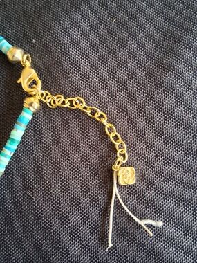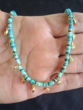 This jewelry set features Kendra Scott Reece sea green mix beads hoop earrings and a matching beaded necklace with gold dangle studs.