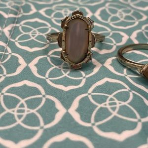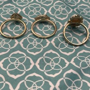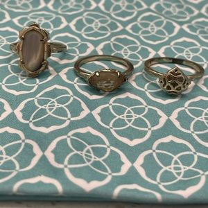 3 stackable Kendra Scott Rings. Some tarnishing and a few scratches on metal. I am not sure the size, but I wear a 6. Does not come with dust bag.