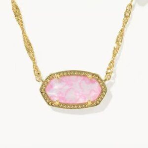 Kendra Scott gold necklace adorned with pink and purple gemstones, paired with