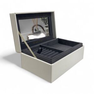Elegant Kendra Scott jewelry box. Cream exterior with black interior. Features mirror and ring slots.