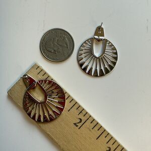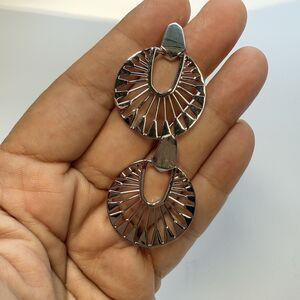 Step into the spotlight wearing the Hattie statement earrings. Featuring bold linear motifs and a front facing hoop design, the statement style will put you front and center right where you belong. In a beautiful shiny silver rhodium over brass finish. Comes brand new on original card. Comes for a smoke free home. Retail cost $48