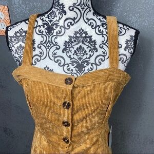 Kenedik corduroy tank dress. Above knee length. Buttons up the front for easy on/off. Adjustable straps. Slight sweetheart neck. 90% polyester 10% nylon. Size large. Color is cognac which is a tan warm brown color