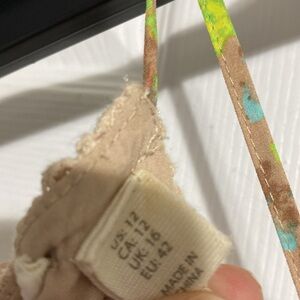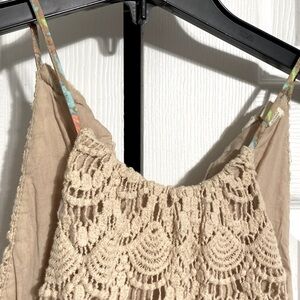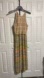 Cotton polyester with polyester lining - lining has a slit. Tan cotton lined Crochet top with blue - green - Peach - greenish Yellow skirt. Lined with zipper back with tie straps which makes them adjustable. Size Approximate Measurements Laying flat: pit to pit 17” - waist 15” no stretch - hip 21” - shoulder to hem 56” - sleeves tie back straps. No name on dress I just know the maker. Preowned good used condition please check all picture