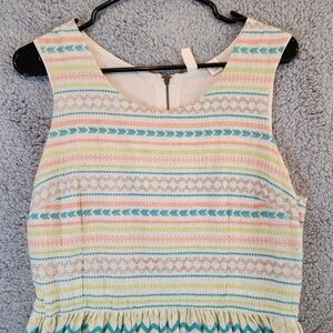 This beautiful Kenji dress is perfect for any casual occasion. The multicolored striped pattern and embroidered accents give it a bohemian flair, while the fit & flare style flatters any body type. The sleeveless design and round neckline make it perfect for warm weather, but it can also be layered for fall and spring. The dress is sized 10 and sold at Anthropologie, with a zipper closure for easy wear. It's important to hand wash only to ensure its longevity. This dress is perfect for those who love vintage-inspired fashion without sacrificing modern comfort.